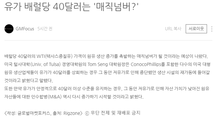 배럴당 40달러의 WTI(텍사스중질유) 가격이 원유 생산 증가를 촉발하는 매직넘버가 될 것이라는 예상이 ...