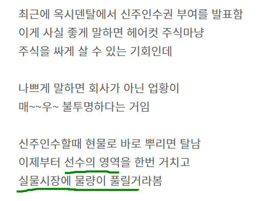 최근에 옥시덴탈에서 신주인수권 부여를 발표함 이게 사실 좋게 말하면 헤어컷 주식마냥 주식을 싸게 살 수 있는 기회인데 나쁘게 말하면 회사가 아닌 업황이 매~~우~ 불투명하다는 거임 신주인